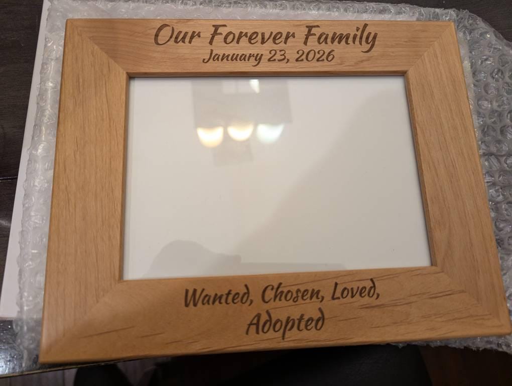Capture the joy and significance of your family’s adoption journey with our beautifully crafted custom engraved photo frame. Designed to honor the unbreakable bonds of love and commitment, this frame serves as a timeless keepsake for your most cherished memories. With a personal touch that makes it uniquely yours, our frame is the perfect way to showcase your family portrait, reminding you every day of the incredible journey that brought you all together. Ideal for gifting or home decor, this frame will be a heartfelt addition to any space.