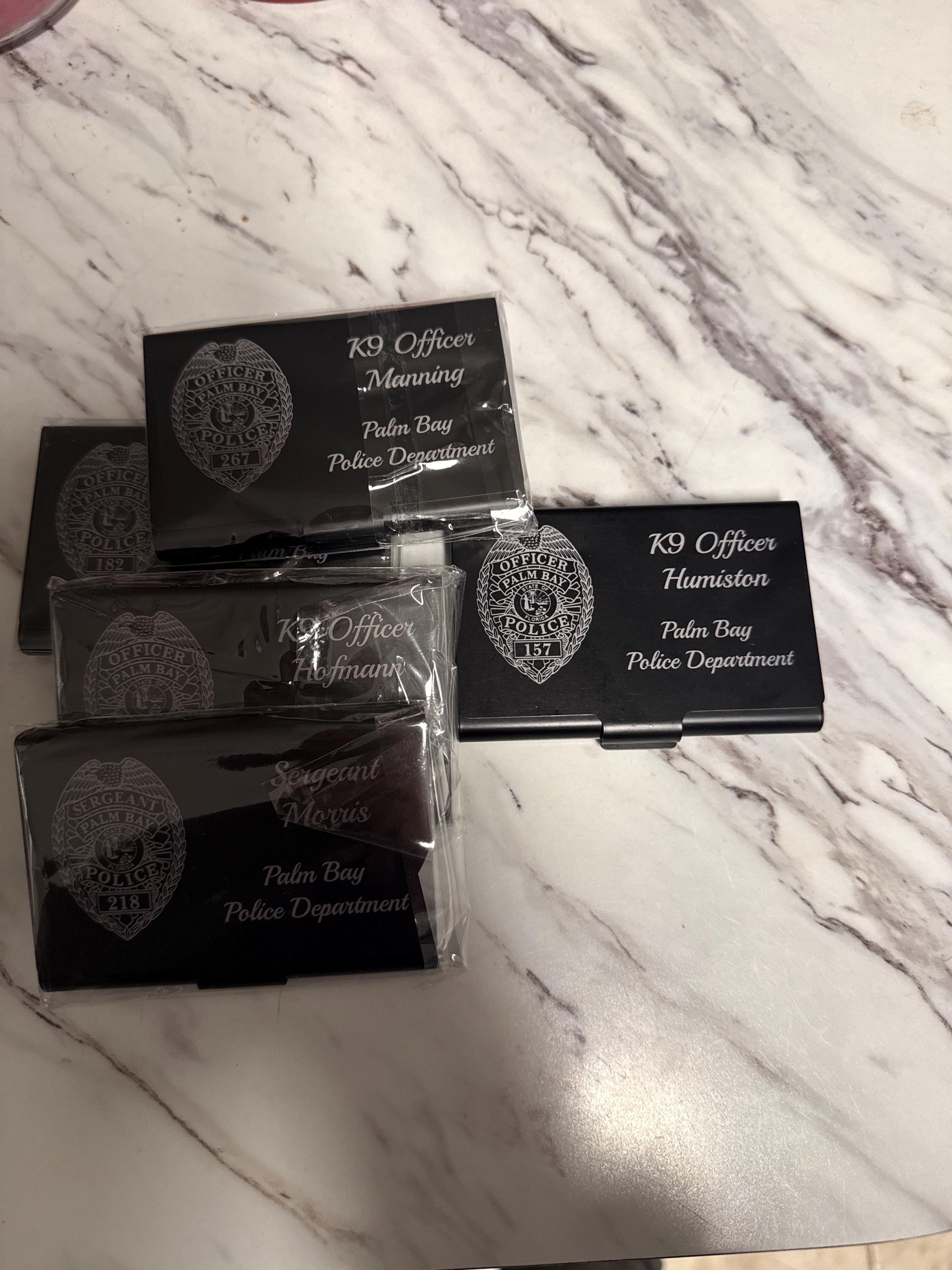 PB+3 business card cases are personalized to meet the specifications of each customer. The cost of this item includes custom artwork and laser engraving. Typically, each case includes the police agency's badge or patch as well as the rank, name, and agency of the officer, deputy, or trooper. We have completed orders for 100's of agencies, so we may already have your agency badge or patch on file. However, for those agencies that are not on file, we may need the customer to provide a photograph of the badge or patch so that we can complete the design required.